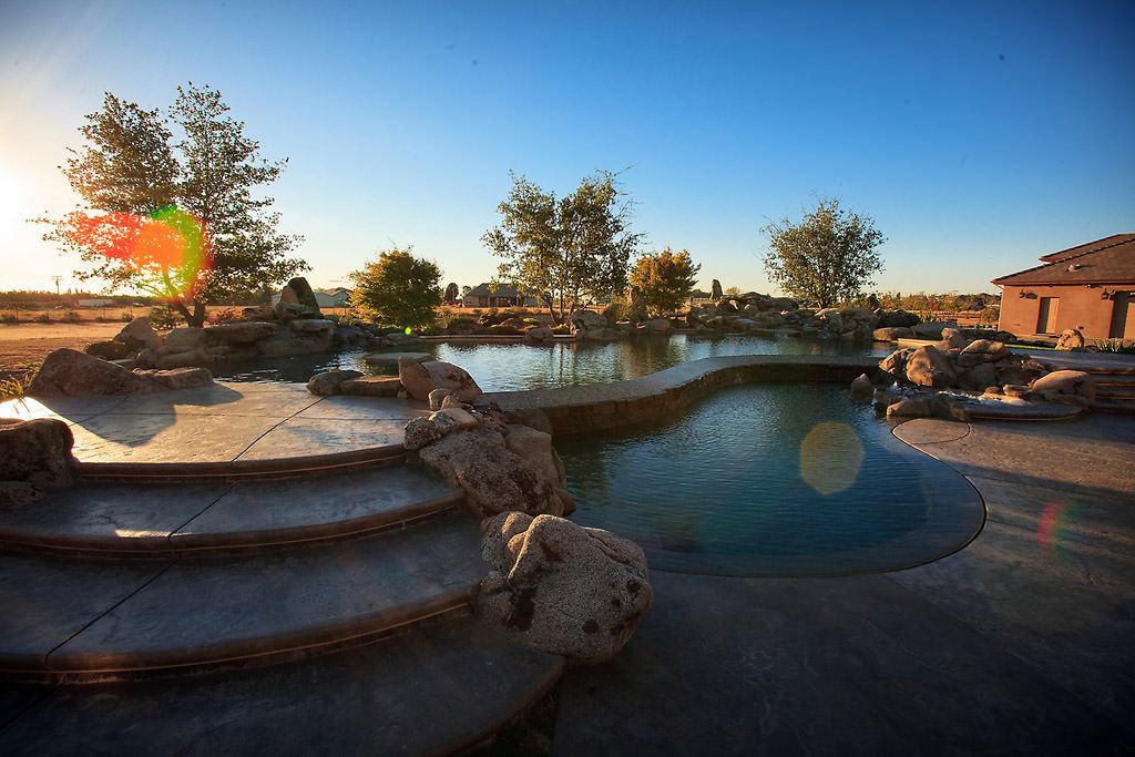 The client wanted a completely natural pool and garden environment which looked and functioned like a mountain swimming hole. We chose all natural finish materials such as stone, boulders, and pebble plaster for the pool, spa and water feature.
