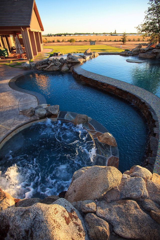 The pool has a Natural Style design with resort living in mind. The design incorporates a water feature, swim in grotto, fire pit, and attached pavilion with cook center.