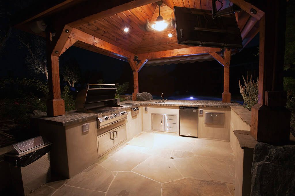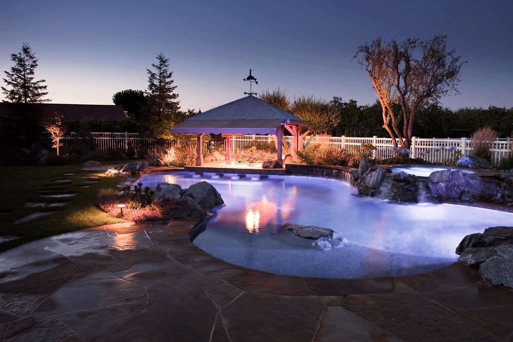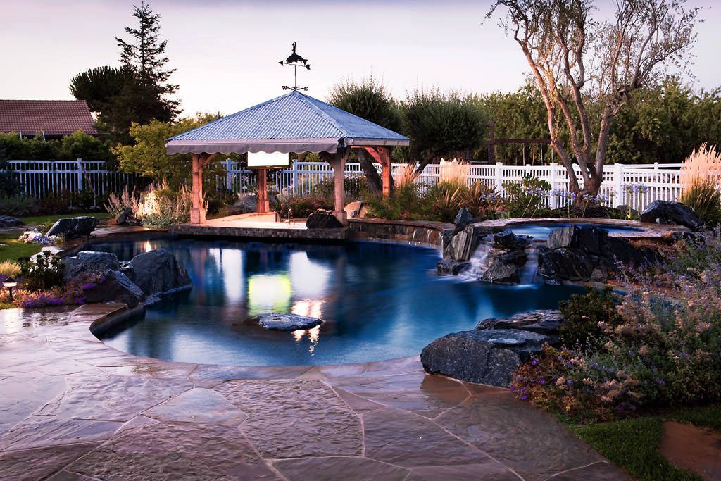 The pool has a Natural Style design with resort living in mind. The design incorporates a water feature, swim in grotto, fire pit, and attached pavilion with cook center.