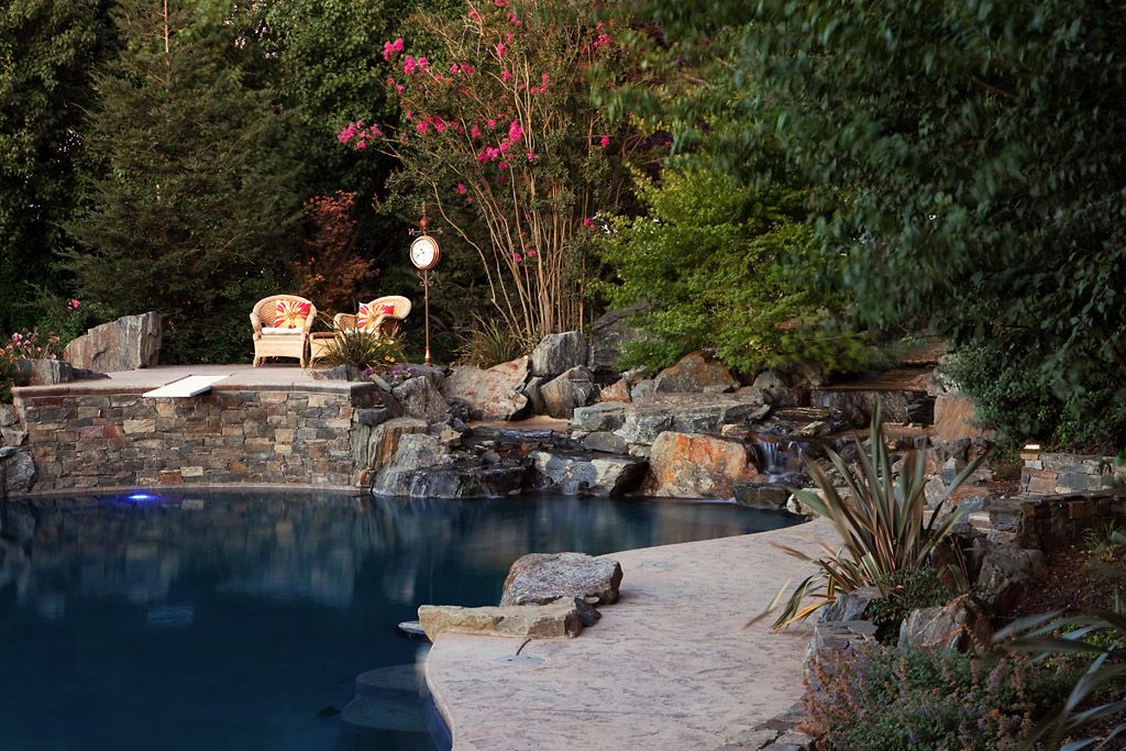 The project is a stay-cationer’s dream getaway. The project includes a 65’ long pool with raised and recessed 14’ diving board, boulder outcroppings above and below the waterline, 15 person spa with stone water feature, and massive boulder waterfall. The pool and pool deck area were lowered 2’ below the existing grade creating informal seating with stone seat benches surrounding the pool, as well as eye catching interest through elevation. Design parameters also include a fire pit area, landscape, solar heating and a 2000 SQFT pool house with many indoor-outdoor features.