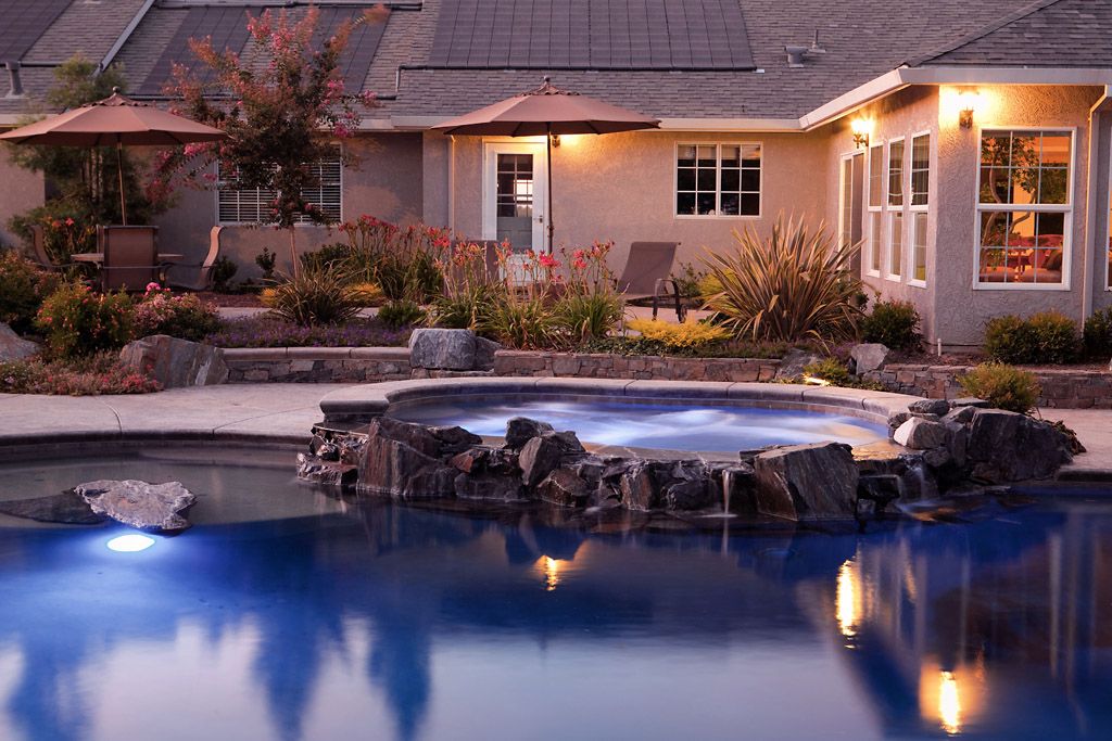 The client wanted a completely natural pool and garden environment which looked and functioned like a mountain swimming hole. We chose all natural finish materials such as stone, boulders, and pebble plaster for the pool, spa and water feature.
