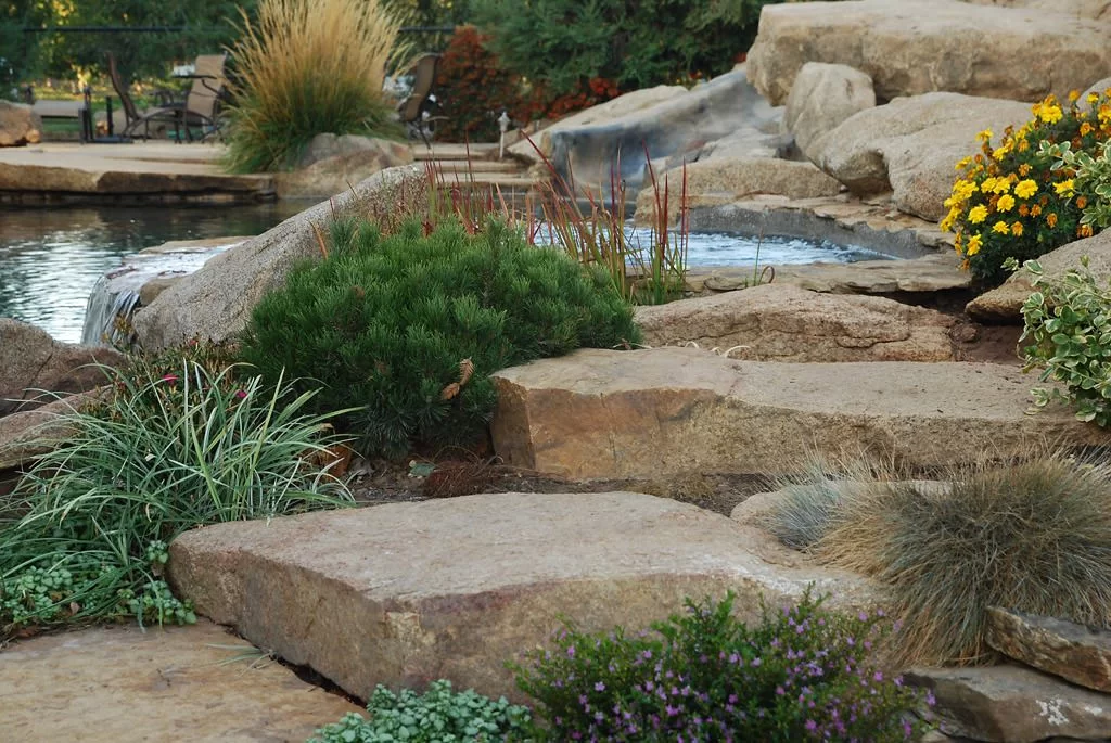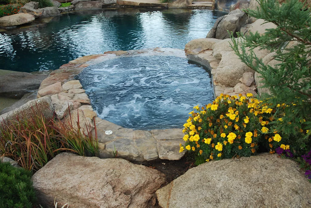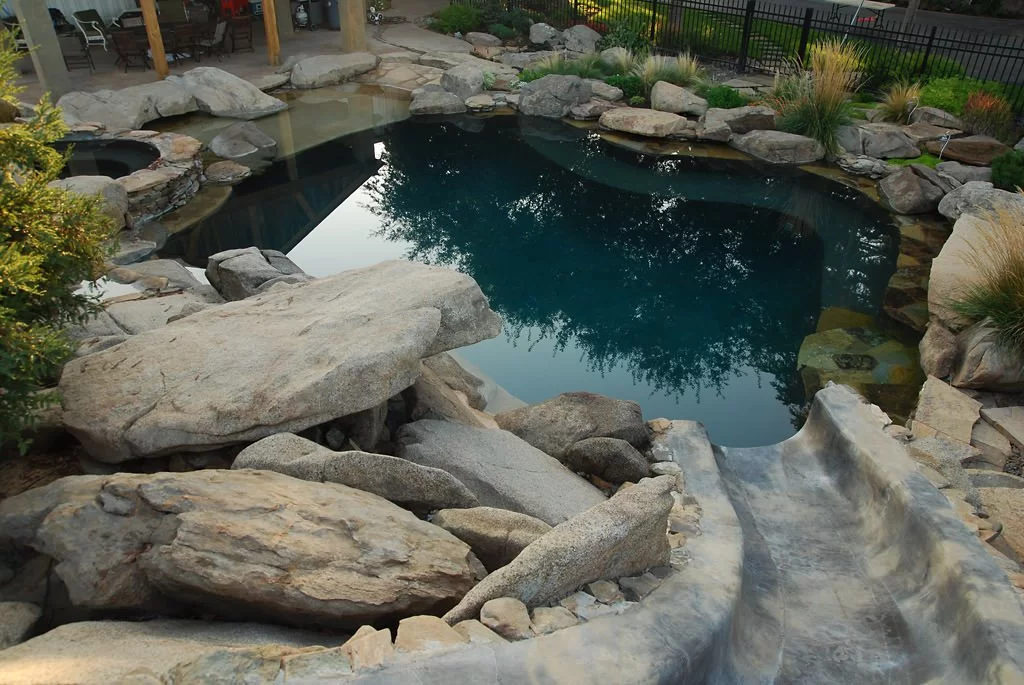 The client wanted a completely natural pool and garden environment which not only looked like but functioned as a mountain swimming hole. To achieve this, we chose all natural finish materials such as stone, boulders, and pebble plaster to use in and around the pool, spa and water feature, and avoided using the variety tile, coping and deck designs found in most pools. We excavated the pool in a constant depth of 10’ in place of the traditional shallow to deep contour. Large shelves and swim out areas were created within the pool, and jump off points were created in the water feature by using two boulders, each weighing five tons, perched above the pool.